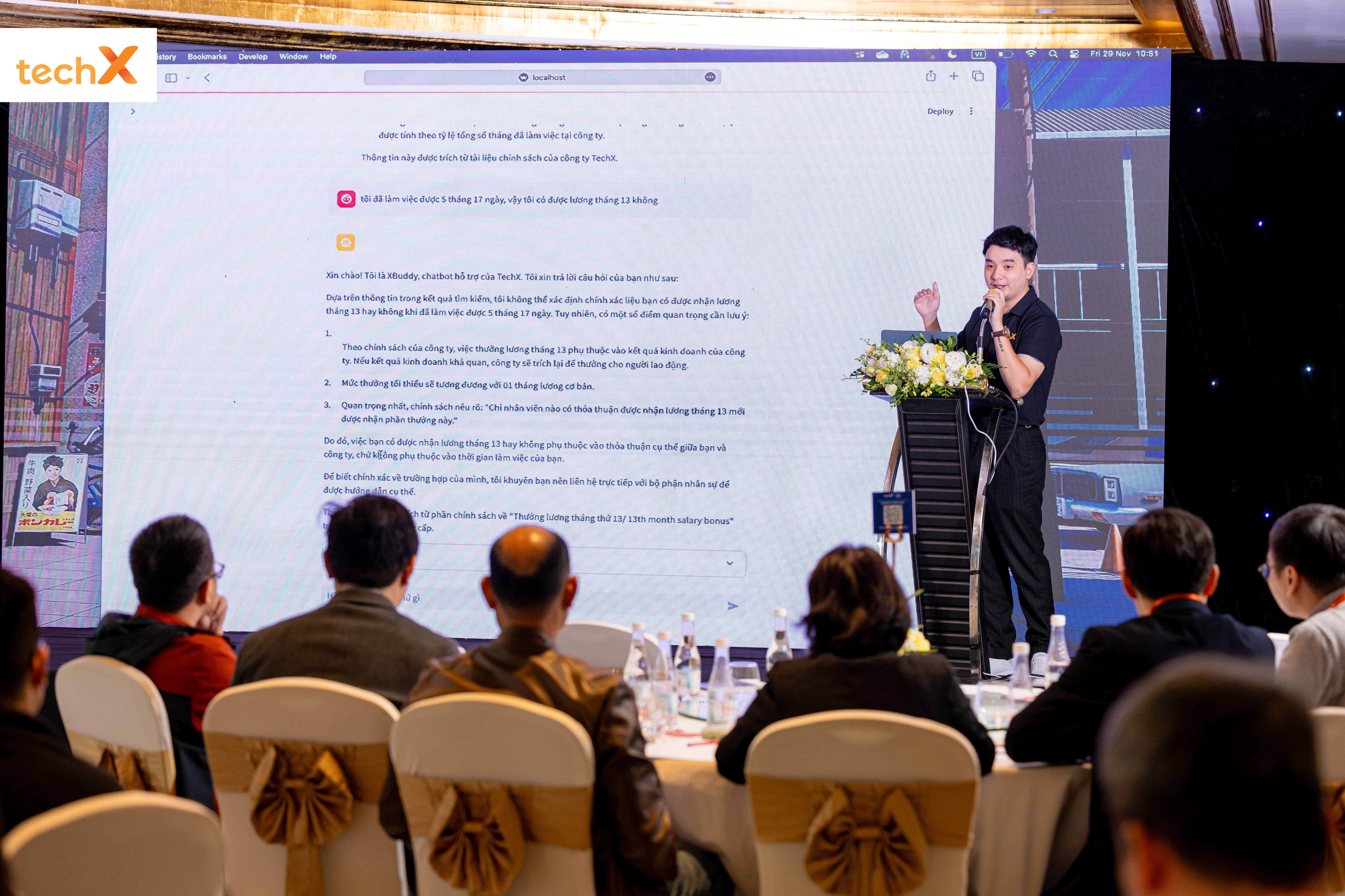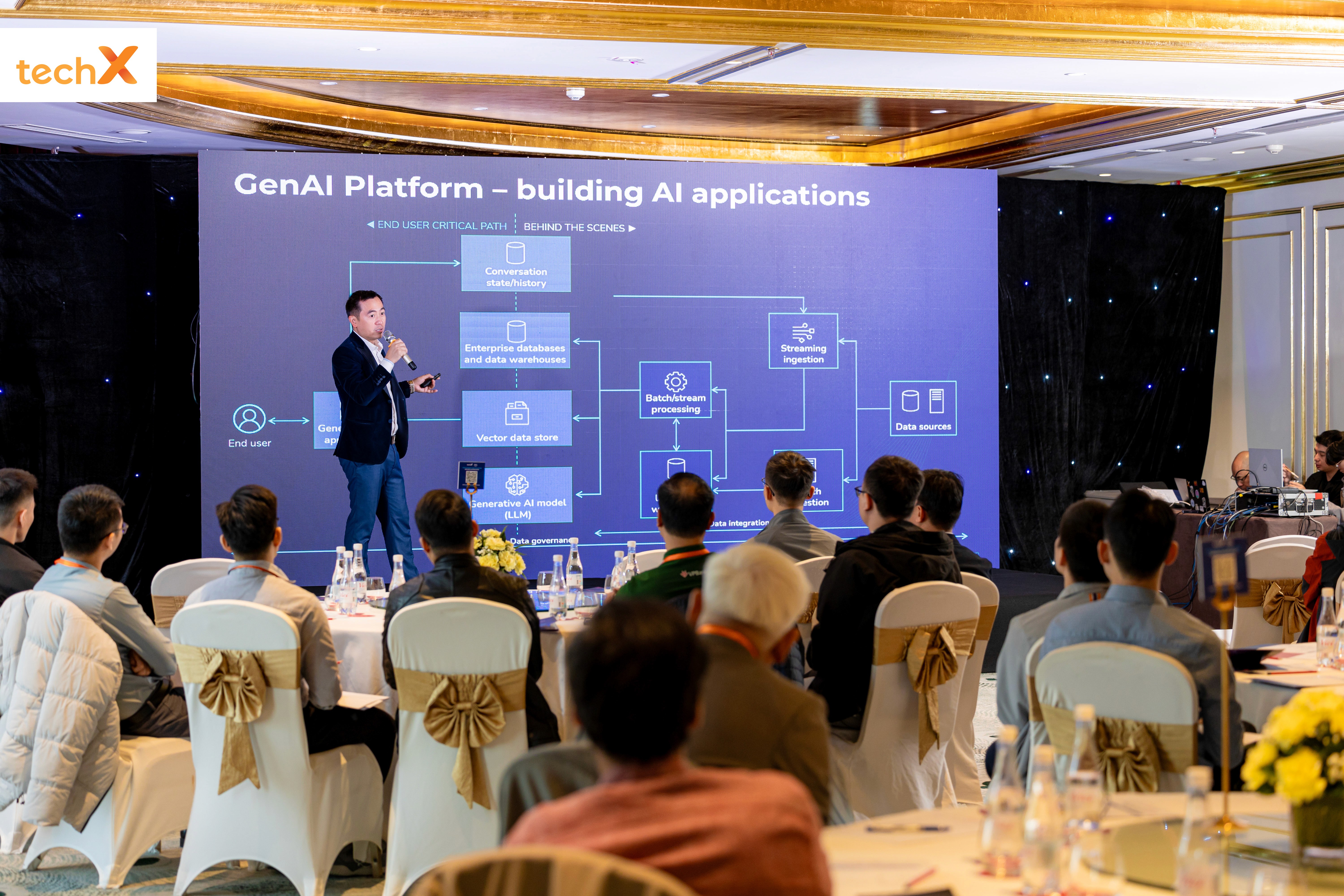 Continuing the momentum, Mr. Ngo Manh Ha, Co-founder and CTO of TechX, delivered a strategic talk on the “End-to-End Business Transformation Roadmap.”  He shared TechX's expertise and extensive experience in supporting hundreds of enterprises to accelerate their digital transformation success. He delved into the comprehensive journey that helps data-driven enterprises harness the power of data to turn it into actionable business value and shift business culture towards data-driven decision-making. Specifically, he introduced Xdata, an advanced data analytics & AI/GENAI platform developed by TechX and how it supercharges building GenAI applications. With an integrated data and analysis cycle designed to be fully automated, it provides valuable and seamless insights, enabling users in the business to transform data into actions and specific goals to achieve business objectives with AI & GenAI.