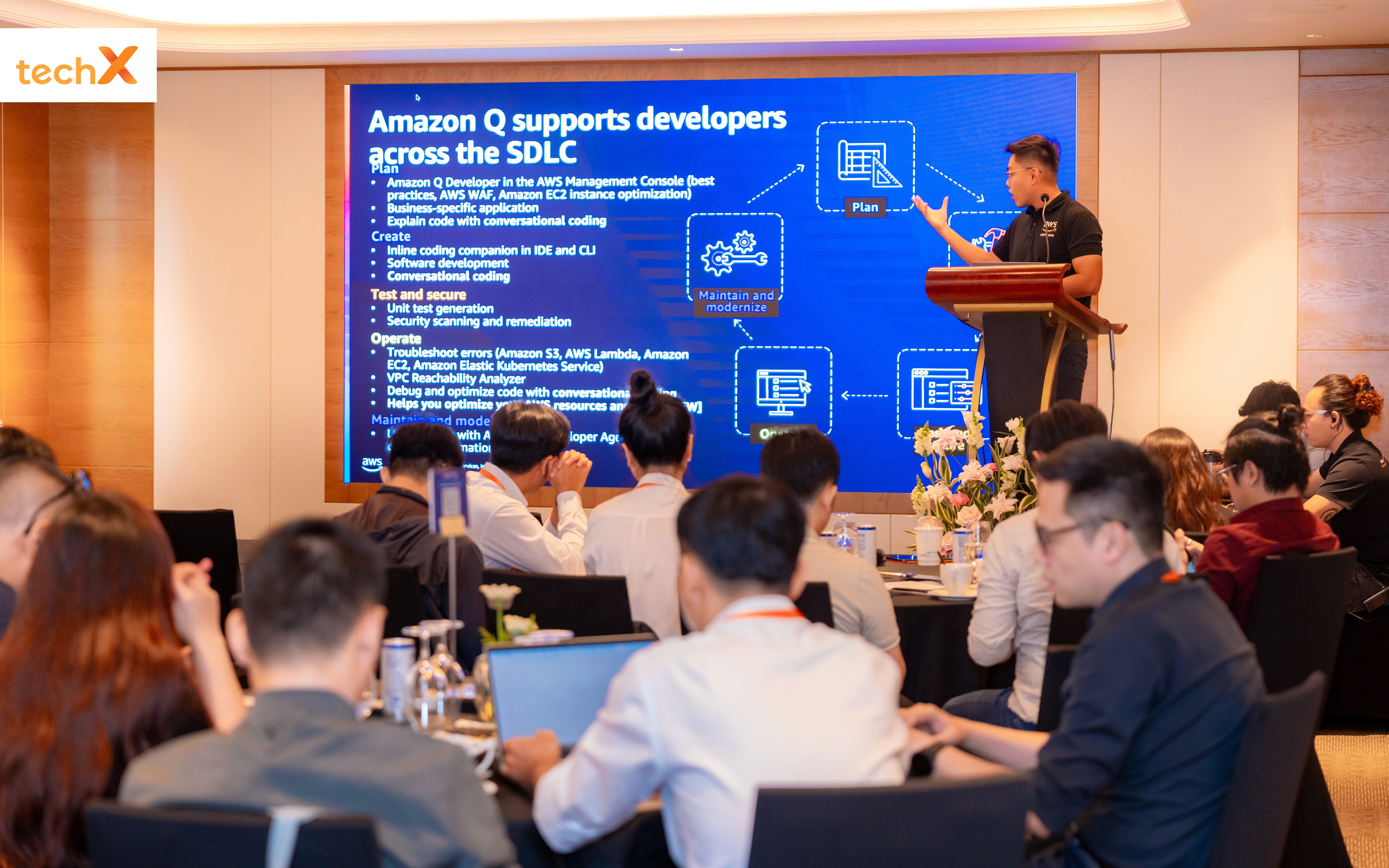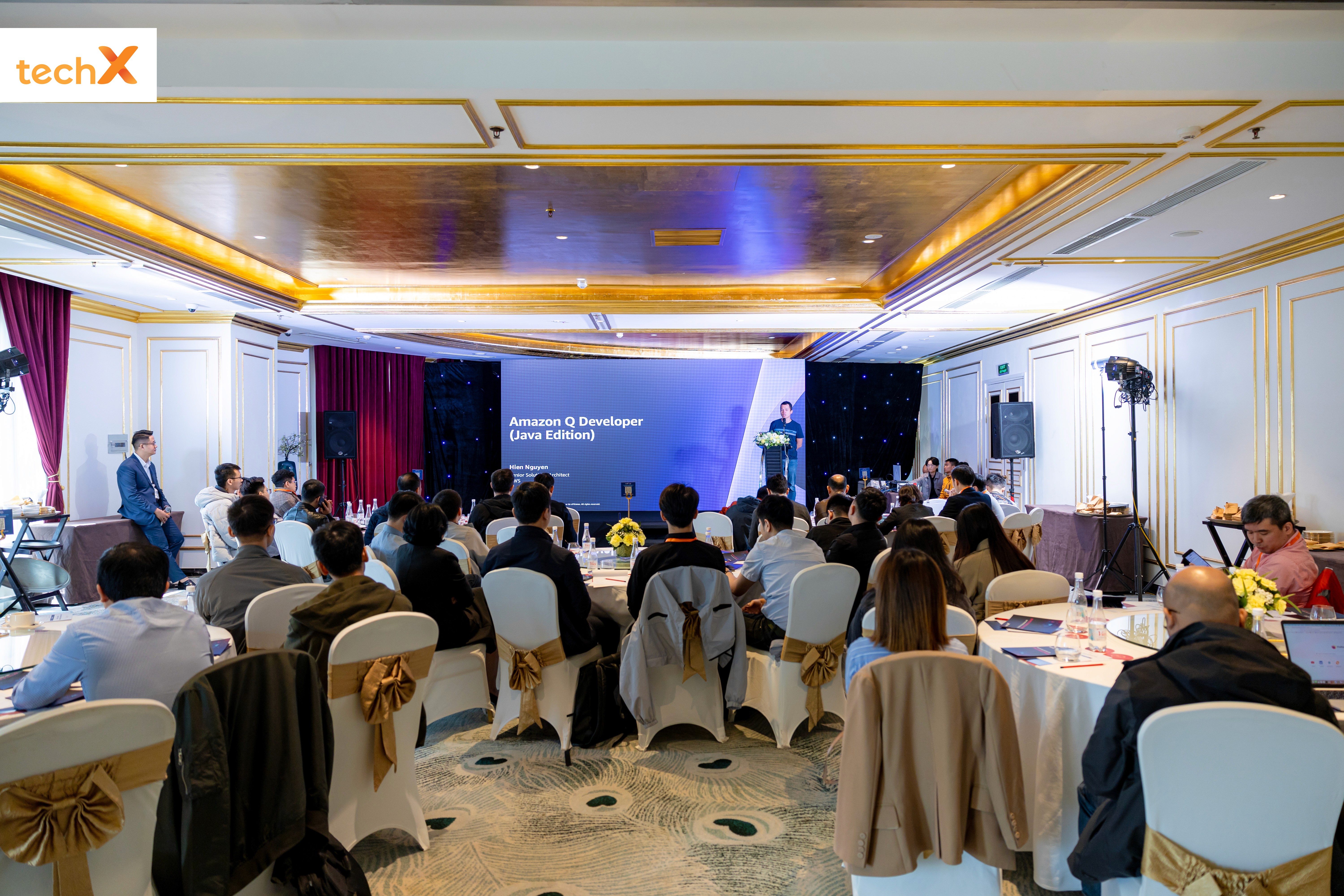Another highlight of the event was the GenAI Showcase of Mr. Duy Doan, GenAI Lead at TechX. He elaborated on three levels of advancements in AI applications that empowered guests by delving into AI use cases for enhancing customer experiences, boosting employees' productivity and creativity, and optimizing business processes. He also showcased live demos in HR Chatbot and Stock Chatbot. After that, Mr. Hien Nguyen, Senior Solution Architect at AWS, and Mr. Phuc Nguyen, Solution Architect & Technical Trainer at AWS. Mr. Hien and Mr. Phuc demonstrated Amazon Q—the GenAI-powered assistant from AWS, showcasing how it streamlines coding and helps businesses work faster while ensuring security and privacy.
