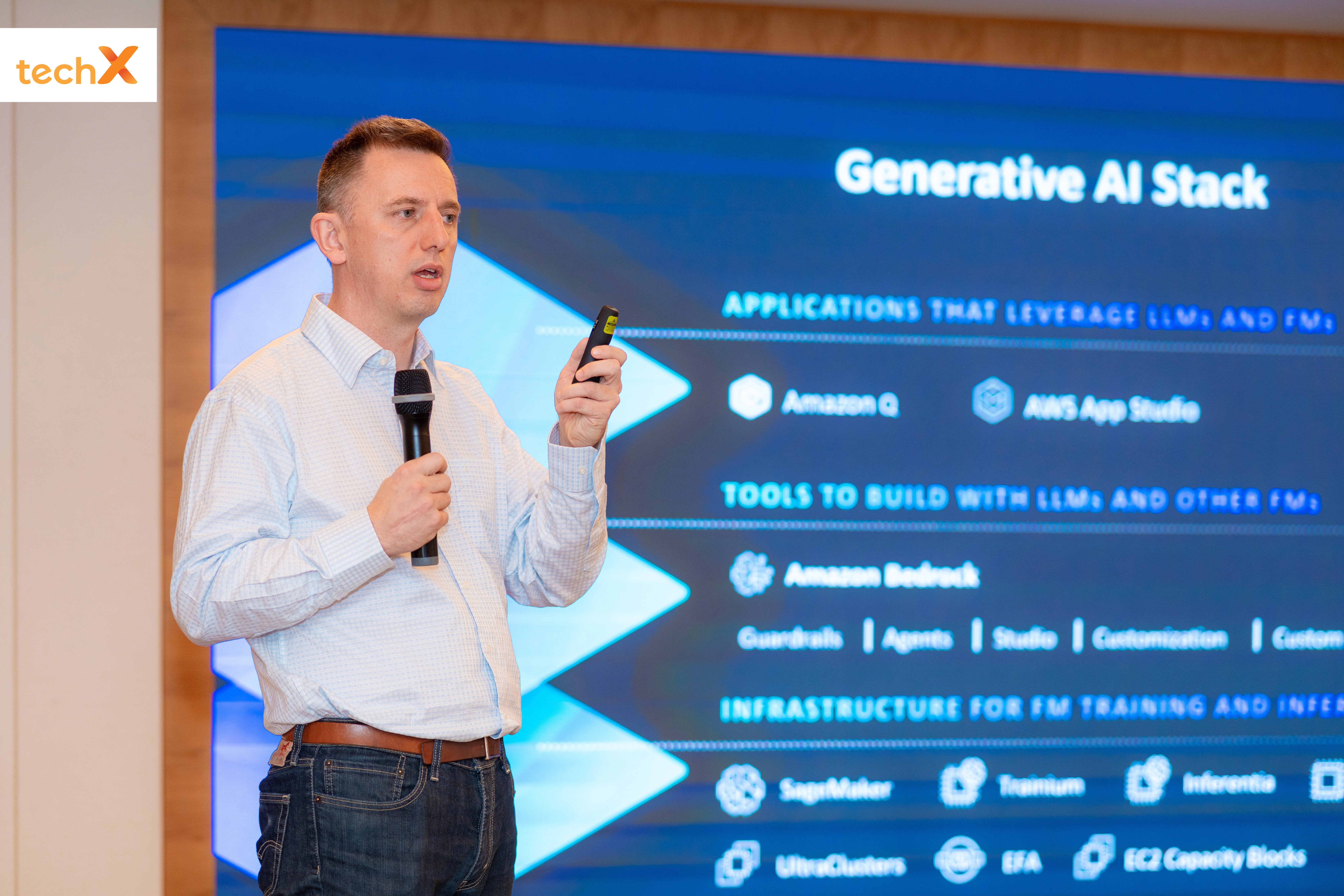 At the event, our delegate guests were inspired by keynotes delivered by speakers from TechX and AWS. Kicking off the event, Mr. Brendan Child, ASEAN AI/ML Partner Specialist from AWS, presented an engaging talk on: “AWS Generative AI Ecosystem and its impacts on business.” This deep dive explored the comprehensive ecosystem of AWS Generative AI, highlighting various tools and services that facilitate scalable, resilient, and cost-effective cloud migrations, forming robust foundations for diverse GenAI applications.