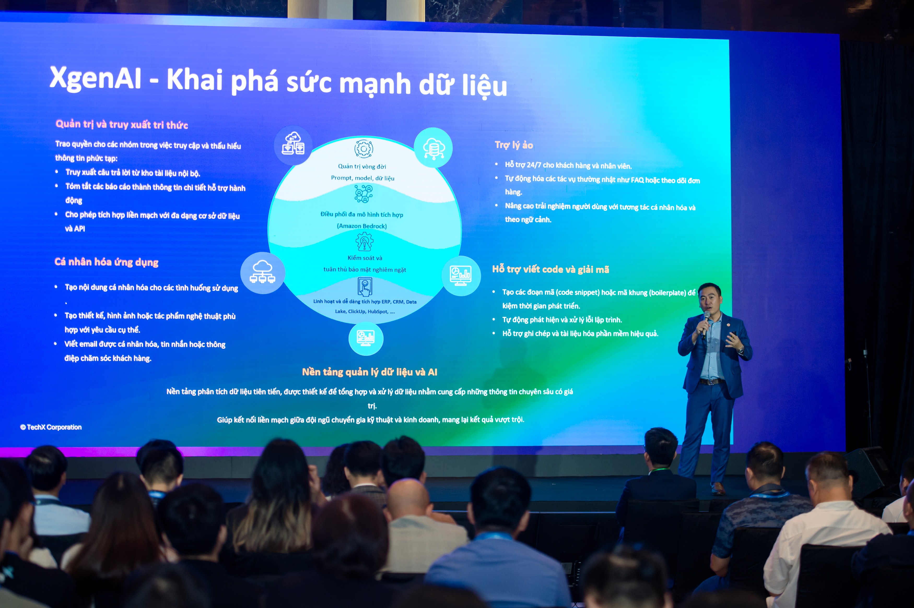 During the highly anticipated FSI track, Mr. Ngo Manh Ha, Co-founder and CTO of TechX, delivered an exclusive keynote: “Transformation in the Era of Growth.” Addressing the specific operational challenges and high expectations of AI/GenAI implementation among financial enterprises, Mr. Ha unveiled the XGenAI suite, developed by TechX on the AWS platform.